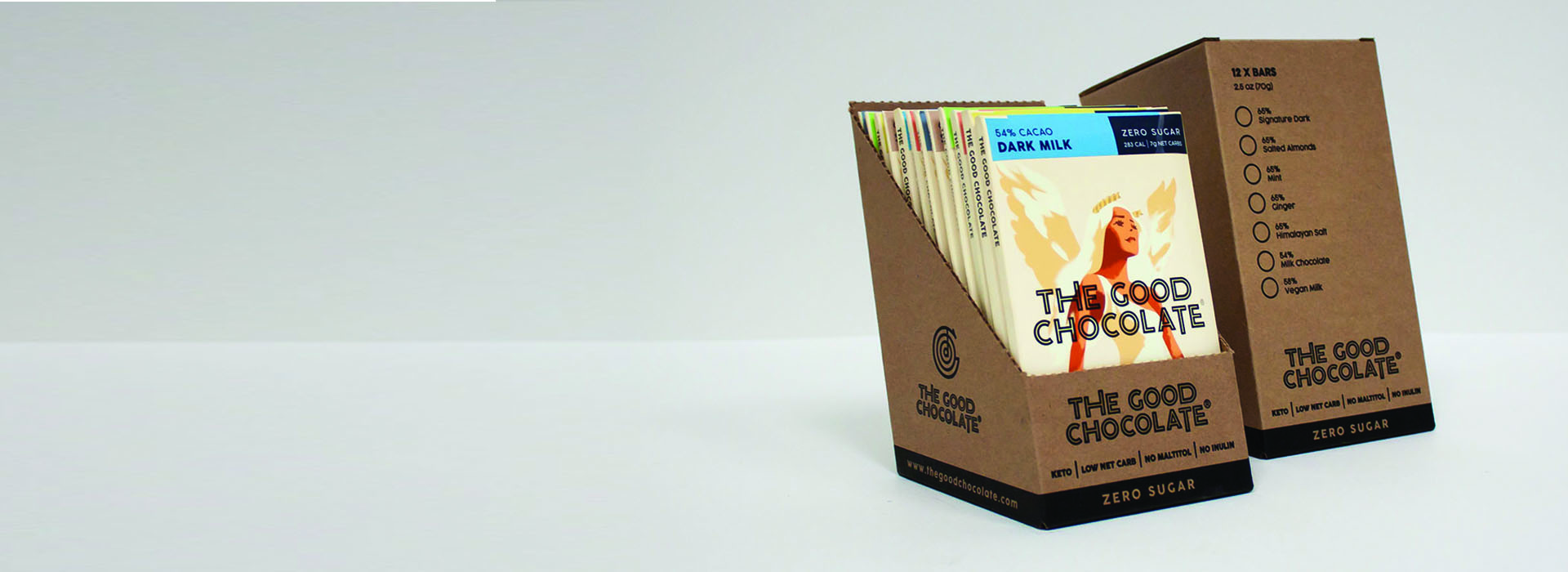 The Good Chocolate Company came to Peek Packaging with a problem many companies face. How do I make a unique packaging solution for a product already in a saturated market? To step out of the norm, we designed a custom chipboard envelope and angled display box.