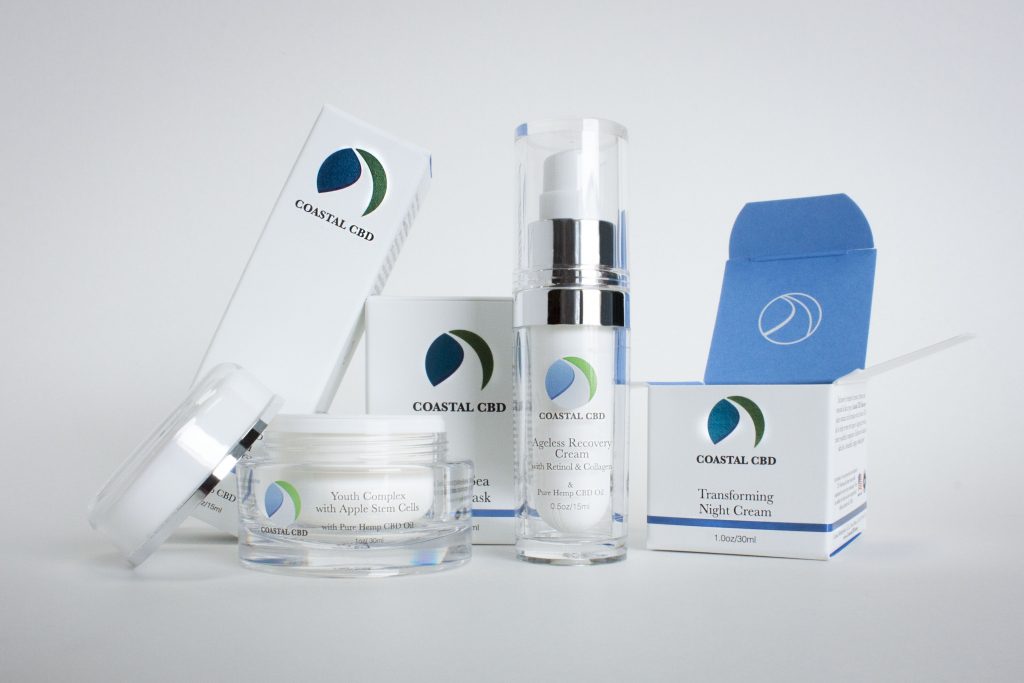 Coastal CBD Skincares’ line of CBD beauty products include a Transforming Night Cream and Ageless Recovery Cream. The line of 13 products are all in various sizes of chipboard box packaging styles finished with Soft Touch for a smooth feel. The packaging is also printed with a colored Cold Foil for the logo, along the bottom area of the box with an accent line, and for the tagline on the top of the box all presenting a metallic look. The Cold Foil also has a Spot UV finish to increase dimension and add shine. The inside of the boxes are also printed in color, creating a nice presentation for the opening experience.