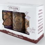 Cookie Babies came to us with a 3 pack product box that could use some improvements. We really liked their box style and graphics, especially the front panel which had a very large window allowing customers to get a very good look at the product. To enhance this look, our team modified the rectangular window to have custom shapes for their cookie baby characters to fit into. This helped bring their branding to life while drawing more attention to the product inside the window. Their logo was prominently displayed above the window. The minimal amount of additional content on the front panel keeps the attention on what matters: the product and the brand. One side panel had catchy phrases to describe their product, while the other side shared how the company started. The back panel had a large version of their logo with a call to action to get more information about Cookie Babies. The graphics effectively showed the many sides of their brand while not being too oversaturated with content.