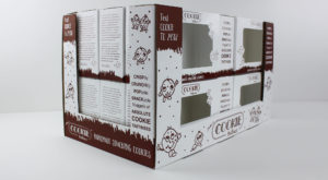 Cookie Babies came to us with a 3 pack product box that could use some improvements. We really liked their box style and graphics, especially the front panel which had a very large window allowing customers to get a very good look at the product. To enhance this look, our team modified the rectangular window to have custom shapes for their cookie baby characters to fit into. This helped bring their branding to life while drawing more attention to the product inside the window. Their logo was prominently displayed above the window. The minimal amount of additional content on the front panel keeps the attention on what matters: the product and the brand. One side panel had catchy phrases to describe their product, while the other side shared how the company started. The back panel had a large version of their logo with a call to action to get more information about Cookie Babies. The graphics effectively showed the many sides of their brand while not being too oversaturated with content.