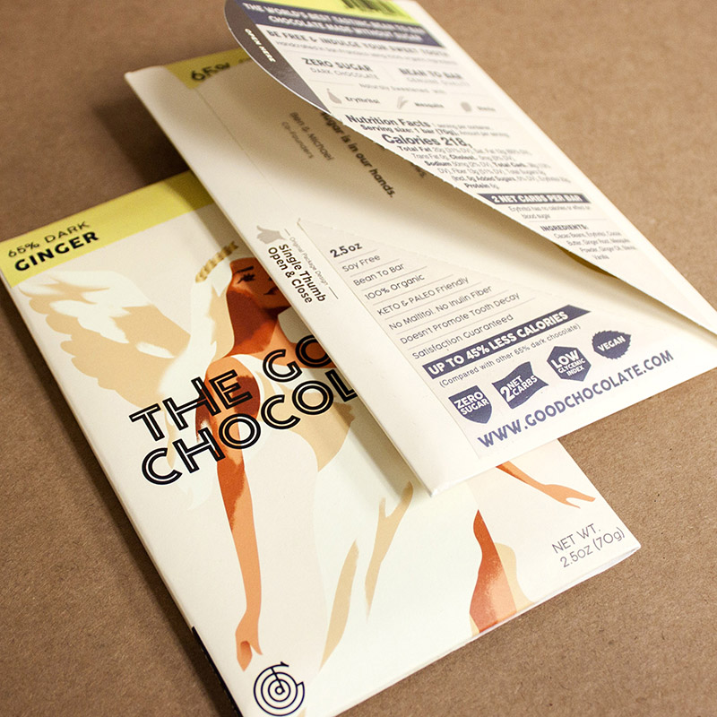 The Good Chocolate Company came to Peek Packaging with a problem many companies face. How do I make a unique packaging solution for a product already in a saturated market? To step out of the norm, we designed a custom chipboard envelope and angled display box.