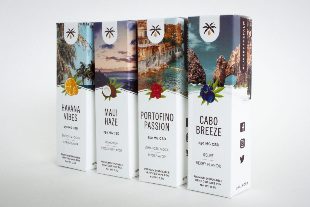 Palm CBD has multiple flavors of CBD vaporizers and were in the early stages of development when they came to Peek. Palm brought coastal artwork to us that represents the multiple flavors of cartridges, so we pre-flighted the art and added a Spot UV varnish to add some shine and pop to their boxes. Another unique attribute to this packaging is the company’s social handles printed on product boxes to promote brand awareness. Lastly, inside of the boxes an accordion fold insert was engineered by our design team to hold the cartridge in place when handling the box.